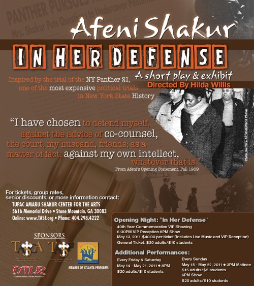 The second is a play entitled Afeni Shakur: In Her Defense and exhibit that premieres tonight at the Tupac Amaru Shakur Foundation in Stone Mountain. Inspired by one of the most expensive political trials ever in the State of New York, this play is opening 40 years exactly from the day Ms. Shakur’s acquittal. The accompanying exhibit includes court records and TV new coverage. This is sure to be well worth the trip out to Stone Mountain ( 🙂 @ my outside of perimeter friends). It runs until May 22, so put this on your calendar as soon as possible!